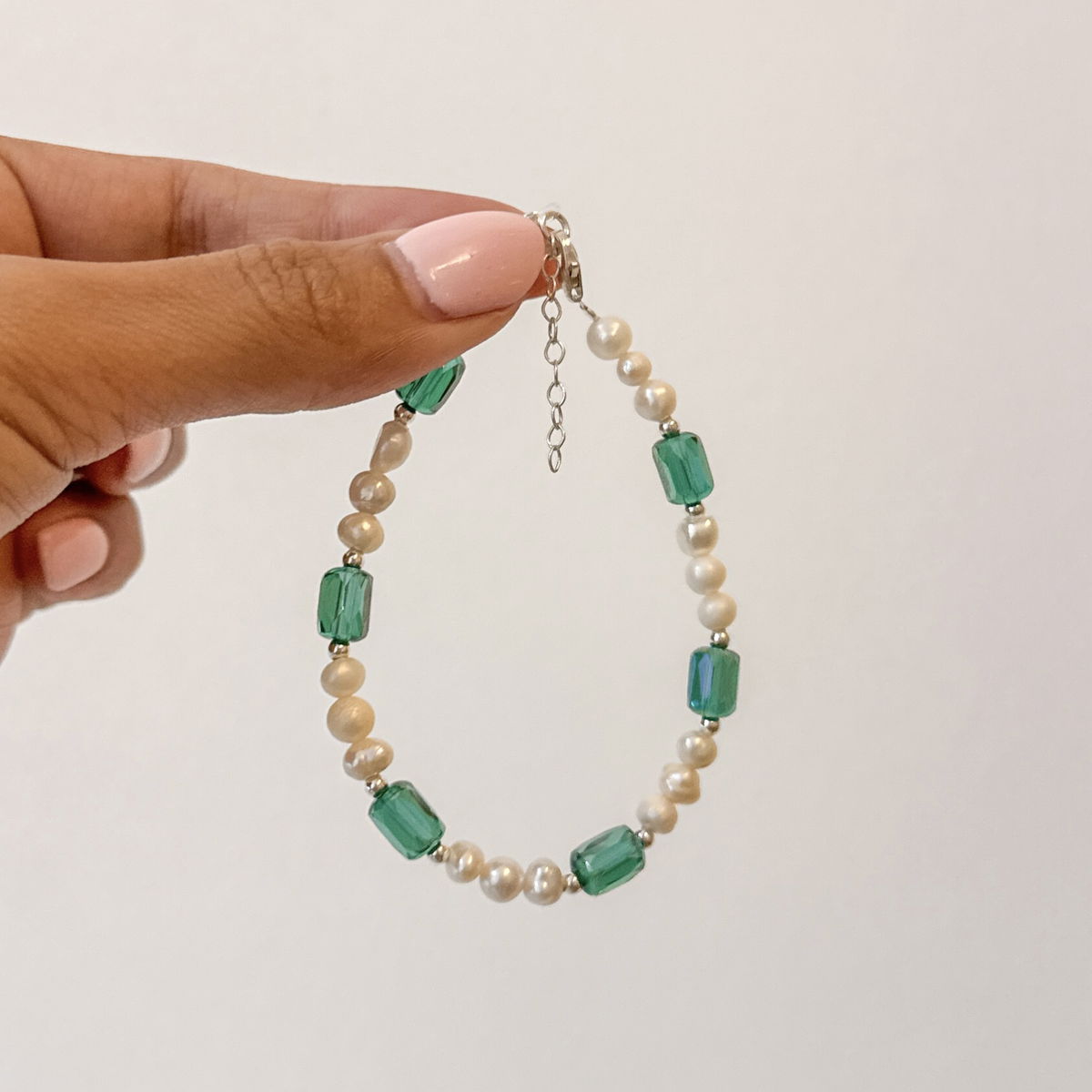 Pulsera Perlas de rio con Cristal Verde